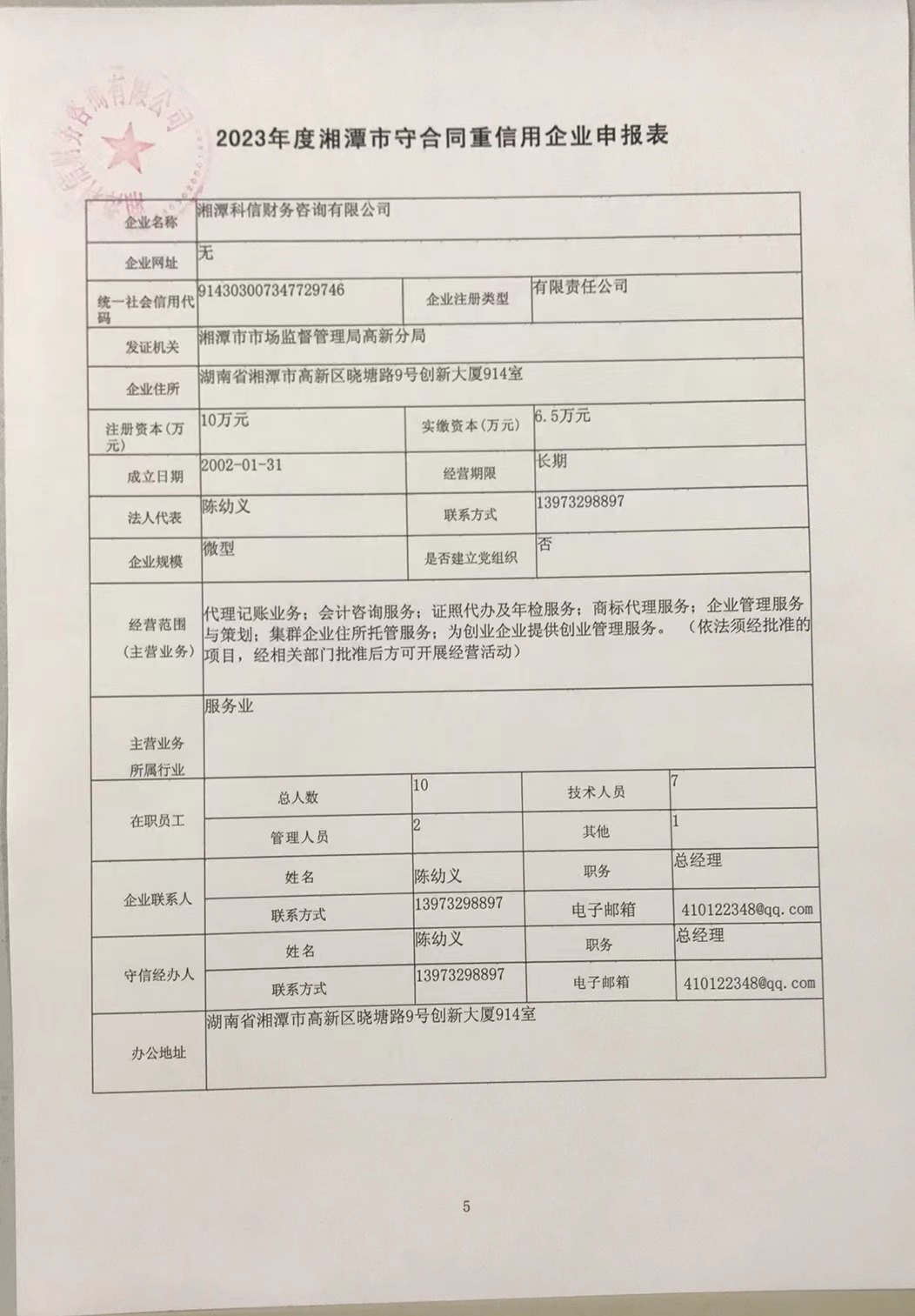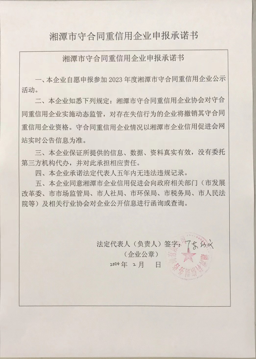 本企業(yè)根據(jù)《湘潭市守合同重信用企業(yè)申報規(guī)定》等編制 2023 年度企業(yè)信用報告書,并保證本報告書內容真實、準確、完整。